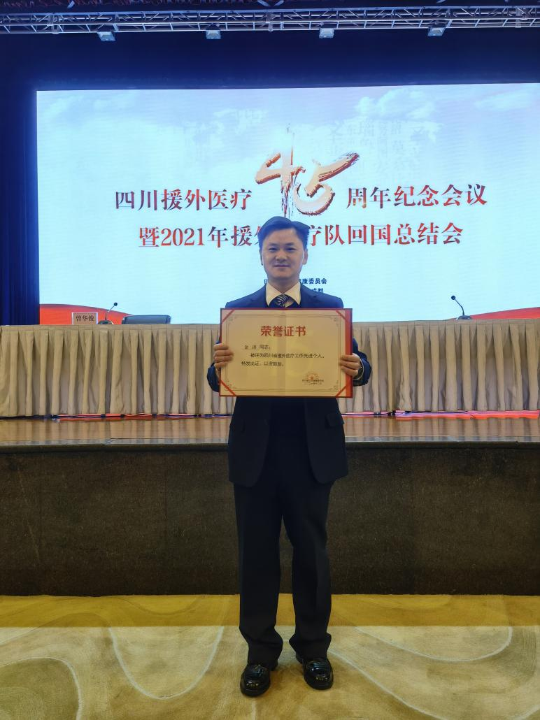 12月14日上午,四川援外医疗45周年纪念会议暨2021年援外医疗队回国总结会在成都召开。四川省卫生健康委党组书记敬静出席会议并致辞。四川省卫生健康委主任何延政出席会议并宣读《四川省卫生健康委员会关于表扬援外医疗工作先进集体和先进个人的通知》。因在援外医疗工作中的突出表现,我院金涛副院长被评为四川省援外医疗工作先进个人;由金涛副院长带队的中国(四川)第22批援莫桑比克医疗队被评为四川省援外医疗工作先进集体。
