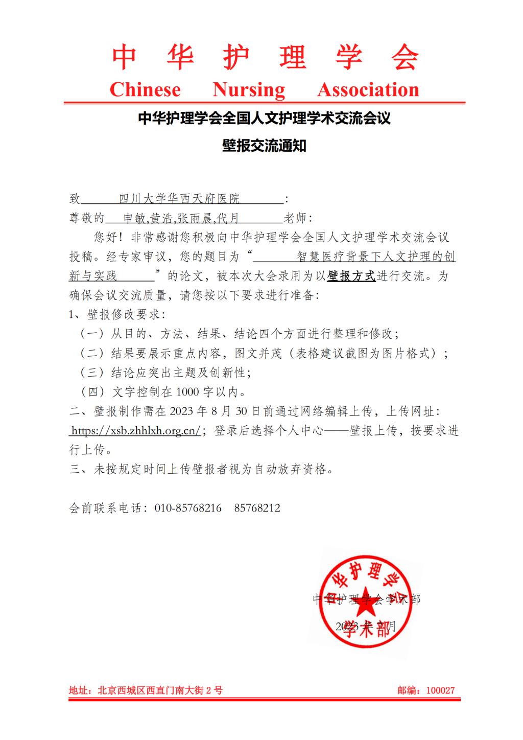 2023年8月31日-9月3日,中华护理学会首届全国人文护理学术会议在湖南省长沙市召开。会议期间,我院共派出4名护理人员参会,并进行题为“智慧医疗背景下人文护理的创新与实践”壁报交流。