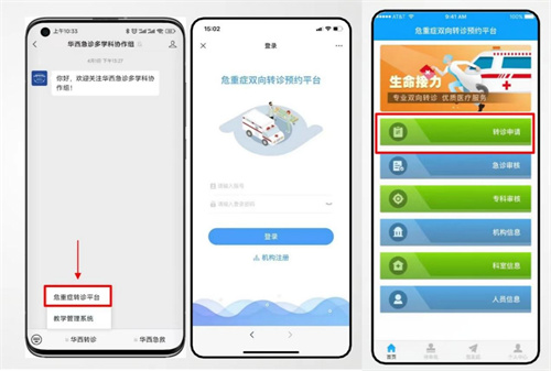 传承华西医院模式,保持与本部急诊科一体化管理,华西天府医院急诊科作为“一院多区”成员同步接入该平台。通过“危重症双向转诊预约平台”,优化资源,协调路径,缩短急诊收治环节,保障院际转诊全流程的精准联动,高效救治。以信息化平台为支撑,急诊科事先与转诊医院沟通患者病情,实现信息互通,降低患者因等待时间长而产生的医疗安全风险。“生命接力”实现有序转诊,为患者提供更加优质的医疗服务。