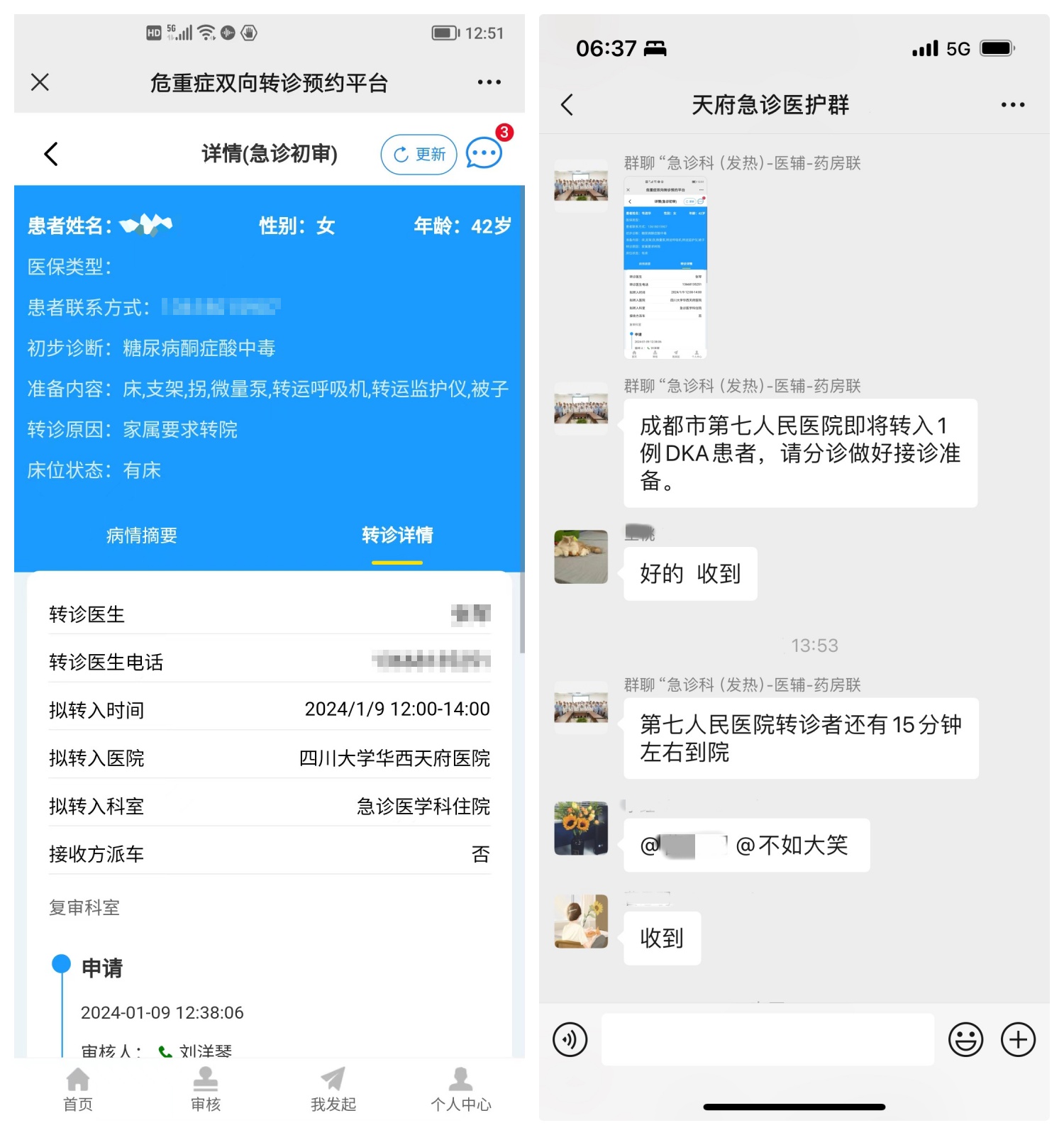 1月9日12:38,依托四川大学华西医院危重症双向转诊预约平台,成都市第七人民医院天府院区重症医学科向我院发起了转诊申请。在收到转诊申请后,我院急诊科住院医师张卓第一时间和对方沟通患者病情,经过评估后,决定接受患者转诊至我院进一步救治。