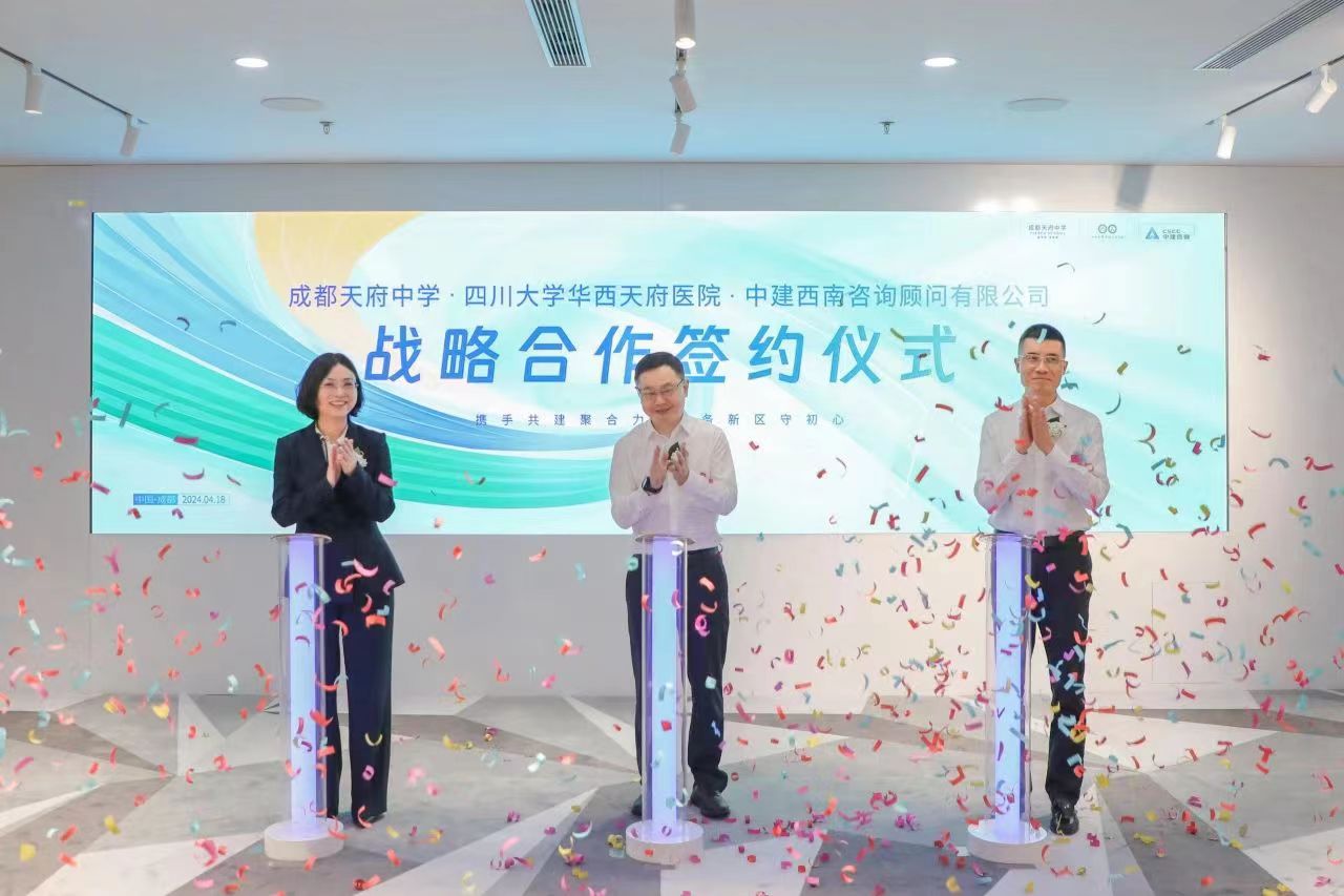 弋理在致辞中表示,天府中学作为天府新区举办的新体制、高水平、国际化一流学校,极大程度提高了新区教育资源水平,为新区青少年成长和人才培养输出天中智慧;华西天府医院自开院以来,始终全方位、全周期保障新区人民健康,为建设公园城市示范区打下坚实健康基础。中建咨询自入驻新区以来,积极投身属地共建,在社区治理、疫情防控、生态环保、青少年关怀等方面开展了一系列工作,希望三方以此次签订友好合作框架协议为契机,持续深化在教育、医疗、建设等方面的合作,服务天府新区高质量发展。