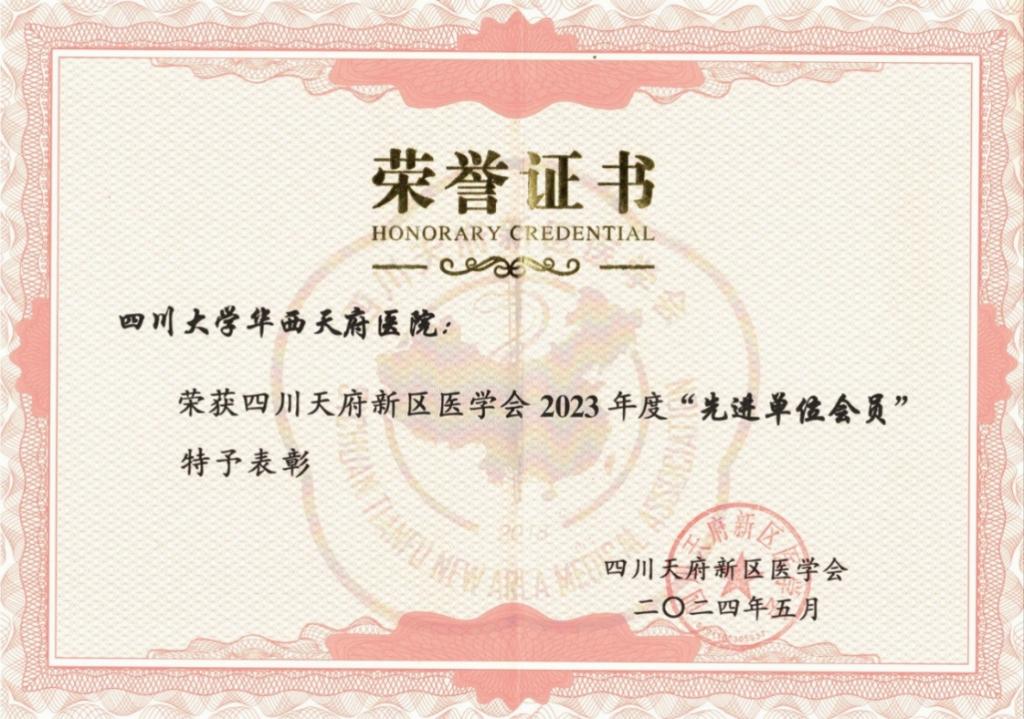 我院获四川天府新区医学会2023年度“先进单位会员”称号