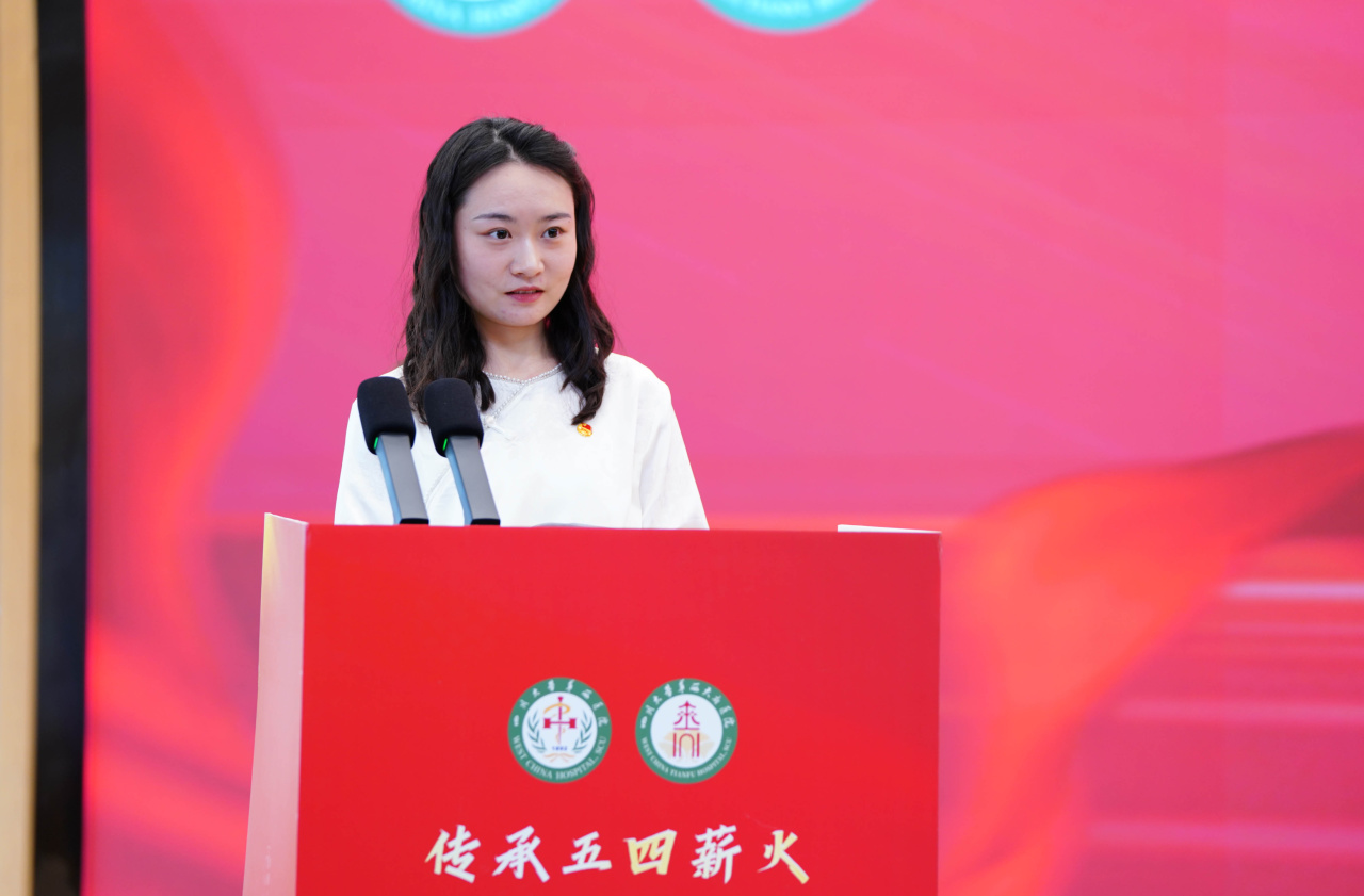 超龄离团团员代表、财务部李璇老师进行了发言。她表示,离团既是一段旅程的结束,更是新征程的起点。无论是否还保留团员身份,她将始终保持共青团员的先进性,传承五四精神,在各自的岗位上发光发热。离团不离心,青春不褪色!作为一名入党积极分子,今后将以共产党员的标准严格要求自己,用实际行动践行“请党放心,强国有我”的青春誓言。