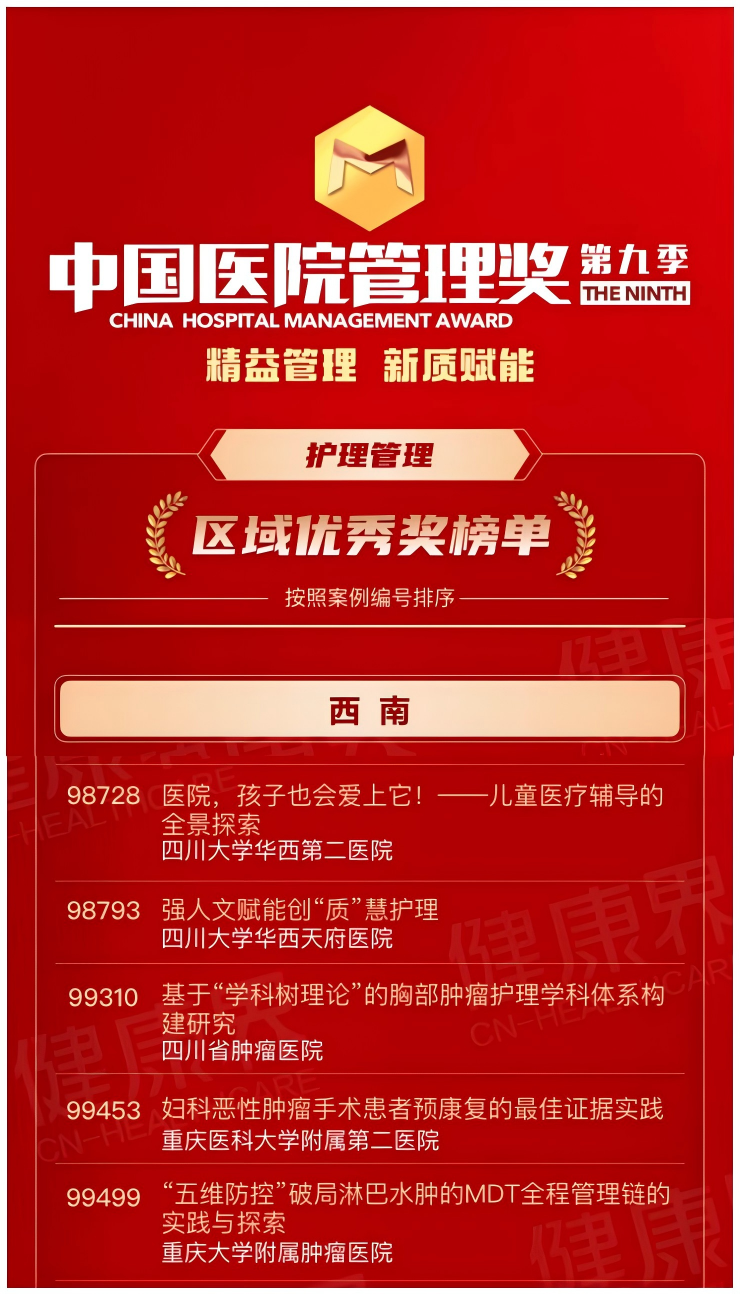 近日,第九季中国医院管理奖区域优秀奖榜单正式公布,我院申报的《强人文赋能创“质”慧护理》案例荣获护理管理主题(西南地区)区域优秀奖。