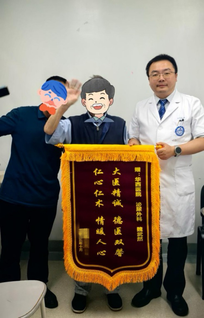 术后一个月返院复查时,何爷爷与家人专程送来锦旗,表达对魏武然主任及泌尿外科全体医护人员的诚挚感谢。这面锦旗,不仅承载着患者与家属的信任与认可,也是医患同心、温情互信的温暖见证。
