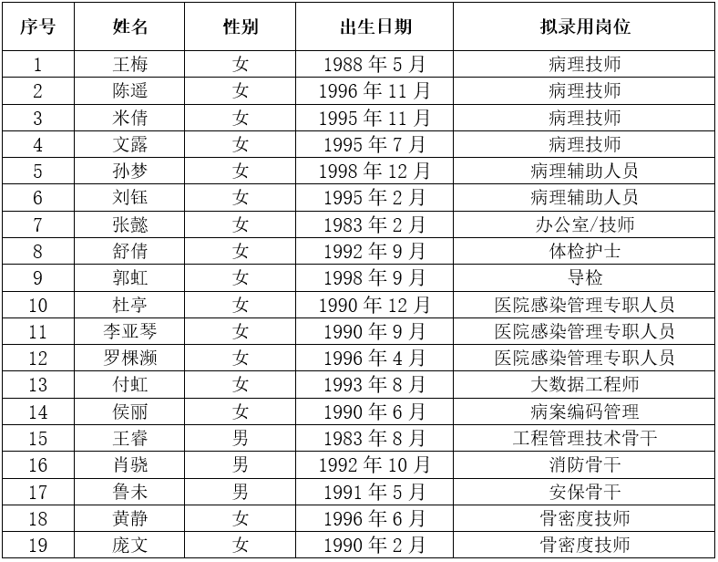 根据相关文件规定,按照公开招聘、择优录用的原则,现将拟录用人员予以公示,公示时间为5个工作日。公示期间如有异议,请实名向华西天府医院人事科教部反映。联系电话028-60660028。