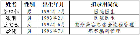 根据相关文件规定,按照公开招聘、择优录用的原则,现将拟录用人员予以公示,公示时间为5个工作日。公示期间如有异议,请实名向华西天府医院人事科教部反映。联系电话028-60660028。