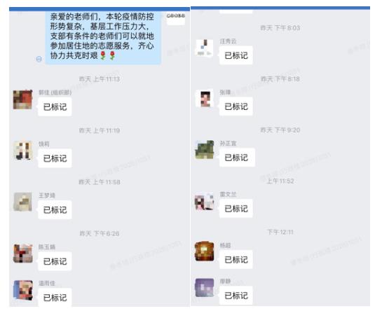 疫情考验初心,旗帜彰显担当。党群党支部广大党员同志和群众积极响应,十余名党员同志先后在“蓉城先锋”平台标记点亮“我是居家党员干部”身份。凡小东、孙正宜、温雨佳、廖冬琼等同志纷纷加入社区防疫志愿服务,协助开展维护秩序、分发物资等工作;麻醉手术中心郑萍、毛永巧、刘连群、吴玉馨、谭秀等五人主动请缨,脱下工作时穿的洗手衣又换上了厚重的防护服,参与到社区核酸采集工作中……不论是党员同志还是群众,大家结合自身实际、根据专业特长,纷纷投入到疫情防控志愿服务。