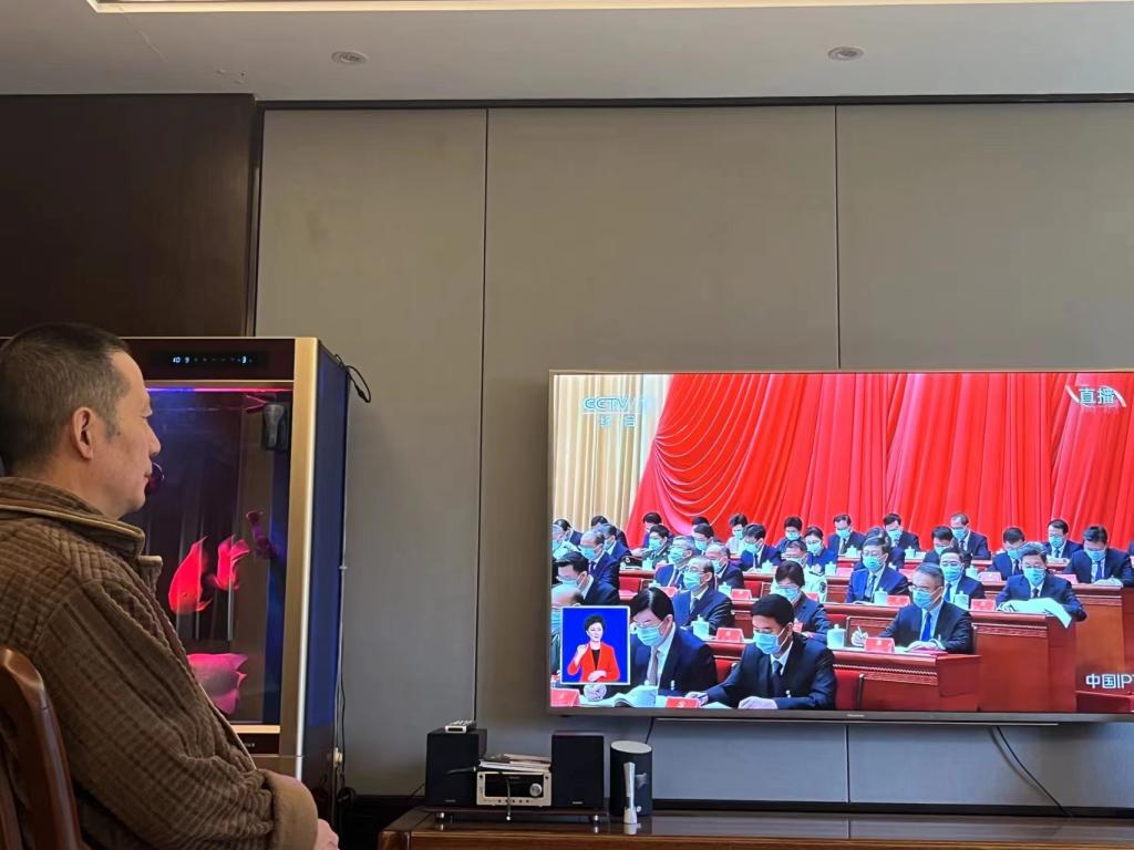▲院领导班子、党员干部、民主党派代表人士和群众们集中观看开幕会直播